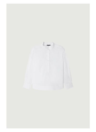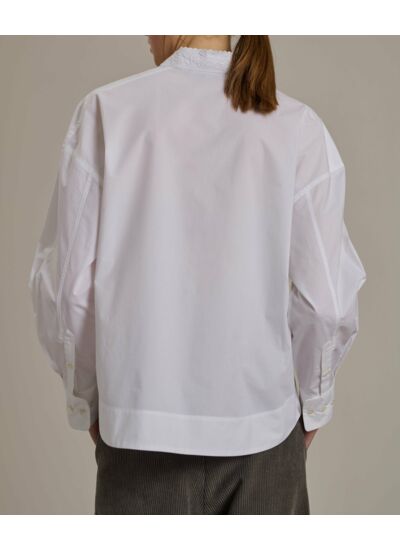 Conçue en popeline de coton légère, cette blouse se distingue par son col montant festonné et brodé, ainsi que sa patte de boutonnage fantaisie. Sa coupe droite et ses manches longues avec poignets boutonnés offrent un équilibre parfait entre confort et sophistication, idéale pour une allure soignée au quotidien ou en occasion spéciale.