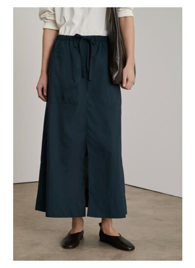 100% coton organique, popeline légère. Taille élastiquée avec lien de serrage. Deux grandes poches plaquées devant. Fente centrale à l’avant. Lavage en machine recommandé. Repassage à température moyenne. Éviter le blanchiment et le nettoyage à sec.