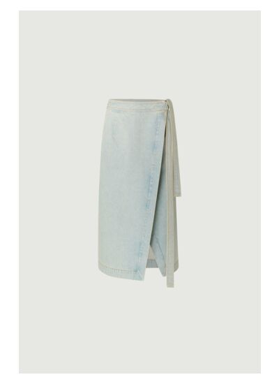 Jupe en jean forme portefeuille, longueur mi-mollet, bouton intérieur discret, ceinture à nouer, poches plaquées côtés. Composition : 100% coton. Entretien : lavage en machine à 30°C, blanchiment interdit, séchage en tambour à température modérée, repassage à 150°C maximum.