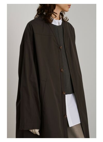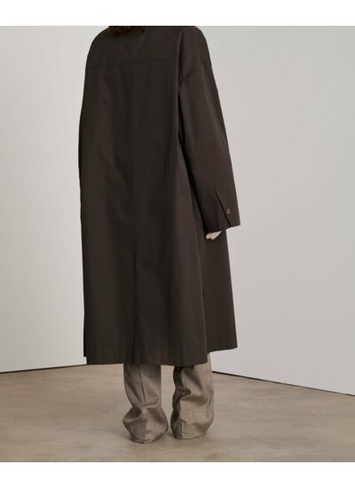 Conçu dans une toile de coton à la main craquante, ce manteau long allie modernité et tradition avec son col en V épuré et ses fentes latérales inattendues. Les poches passepoilées et l’ouverture boutonnée devant renforcent son allure fonctionnelle et raffinée, offrant une silhouette fluide et confortable.