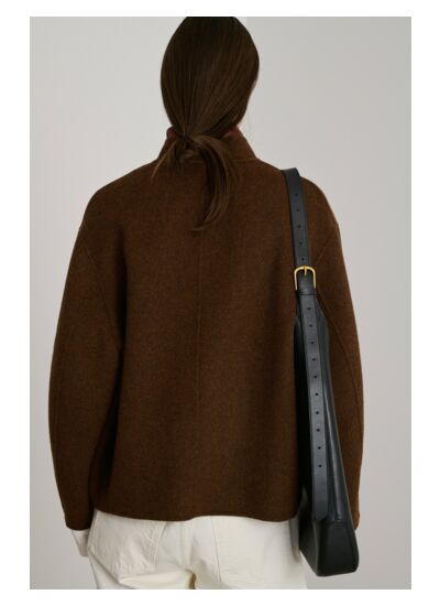 Conçu sans doublure pour une légèreté maîtrisée, ce caban mise sur des détails soignés : patte de boutonnage semi-cachée, poches plaquées rondes et finitions gansées qui sculptent son volume arrondi. Le kaki doré de la laine double face offre une teinte subtile et facile à associer, tandis que la coupe oversize invite à jouer avec les proportions pour un look contemporain.