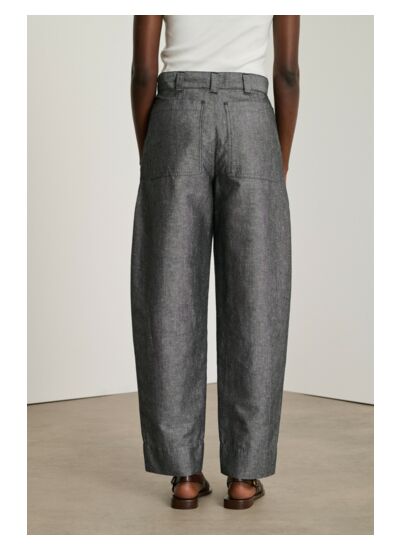 Composition : 56% lin, 44% coton ; doublure 100% coton. Coupe taille haute avec volume arrondi. Ceinture boutonnée, fermeture éclair. Poches dos plaquées rectangulaires et poches côtés insérées dans la couture.