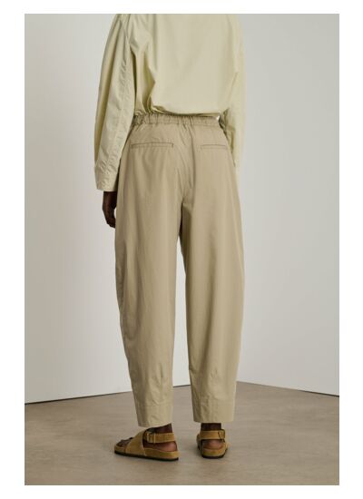 Confectionné en popeline de coton légère et délavée, ce pantalon offre un volume ample et une silhouette légèrement arrondie, idéale pour toutes les morphologies grâce à sa taille élastiquée ajustable par lien de serrage. Les poches discrètes et les pinces en bas de jambe apportent une finition soignée qui équilibre décontraction et sophistication. Associez-le à un blazer structuré et une chemise pour casser les codes et affirmer votre style.