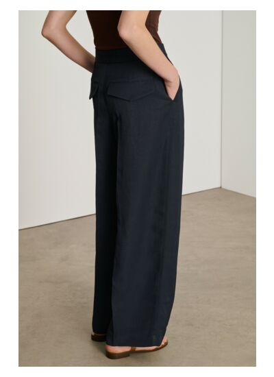 Réponse : Le pantalon est en mélange de lin et viscose légèrement flammé, avec une doublure 100% coton.