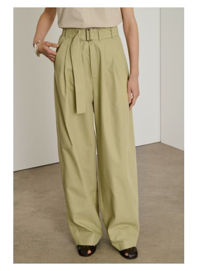 Pantalon ample à pinces, jambes larges et longues. Ouverture sécurisée par crochets et bouton intérieur. Ceinture amovible avec boucle pour un ajustement parfait. Deux poches italiennes devant, deux poches passepoilées au dos. Matière : gabardine de coton 100% organique, doublure 100% coton.