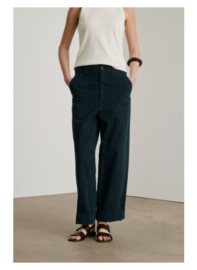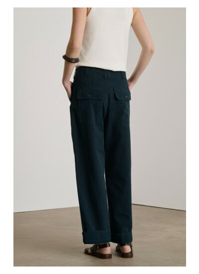 Confectionné dans une toile de coton texturée, ce pantalon se distingue par sa teinte ardoise foncée qui apporte profondeur et caractère à votre tenue. Les grandes poches plaquées, à l’avant comme à l’arrière, renforcent son esprit utilitaire tout en offrant une praticité optimale. L’ouverture boutonnée et zippée facilite l’enfilage, tandis que la coupe fluide garantit une liberté de mouvement idéale au quotidien.