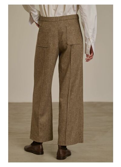 Affirmez votre élégance avec ce pantalon en laine à chevron, alliant tradition et modernité. Sa coupe droite légèrement évasée sublime la silhouette avec une touche de sophistication intemporelle.