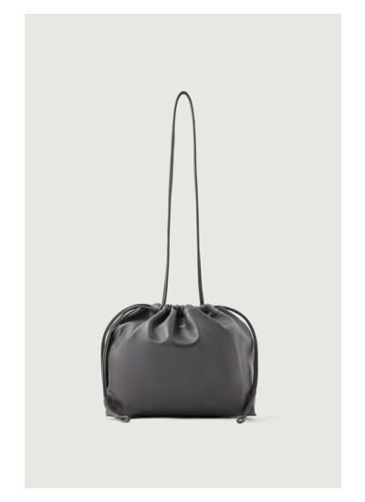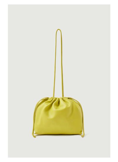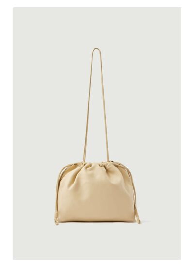 Petit sac bourse en cuir souple jaune pâle, porté épaule. Hauteur : 19,5 cm, Longueur : 24 cm, Profondeur : 6 cm. Longueur anse : 74 cm. Fermeture froncée par les anses. Matière : 100% cuir de mouton certifié LWG. Entretien : lavage interdit, blanchiment interdit, séchage en tambour à température modérée, repassage interdit, nettoyage à sec avec solvants doux.