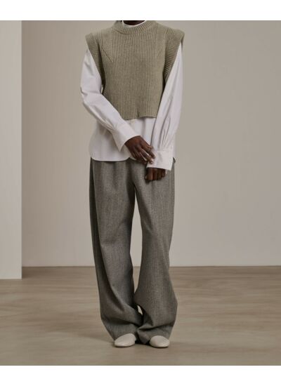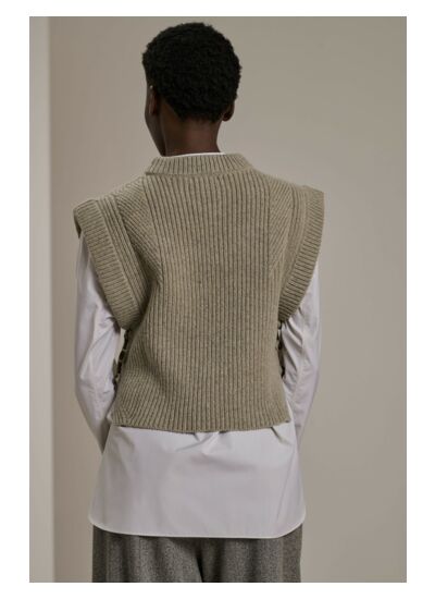 Adoptez l’élégance minimaliste avec ce pull sans manches au design épuré et moderne. Sa coupe droite et son col rond montant apportent une silhouette structurée, idéale pour sublimer toutes vos tenues.