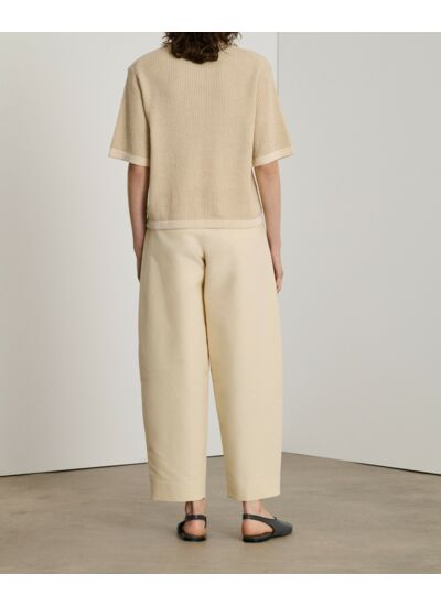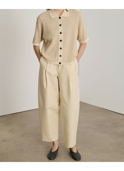 Coupe droite, manches courtes, col polo, ouverture boutonnée devant. Finitions en bord côtes au bas du corps et aux poignets. Maille de moyenne jauge en mélange 50% coton organique et 50% laine mérinos.