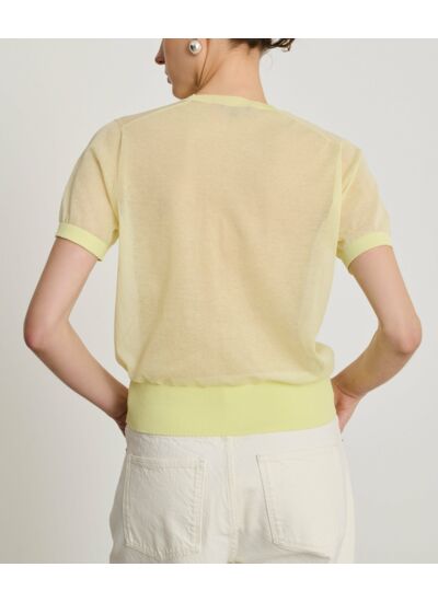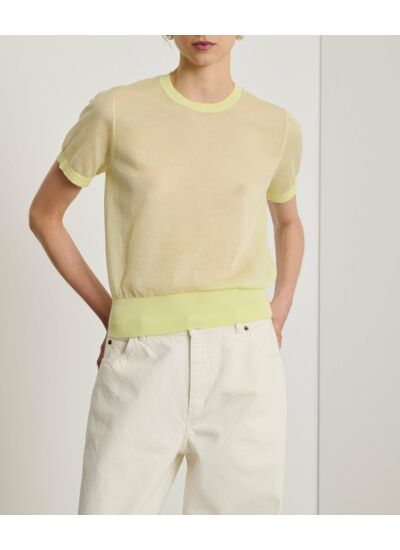 Confectionné dans une maille ultra fine, ce pull manches courtes dévoile subtilement la peau ou s’associe parfaitement à un top selon l’ambiance désirée. Sa coupe droite, resserrée en bas, structure la silhouette tout en offrant un confort optimal. Le col rond apporte une touche classique qui équilibre la modernité de la transparence.