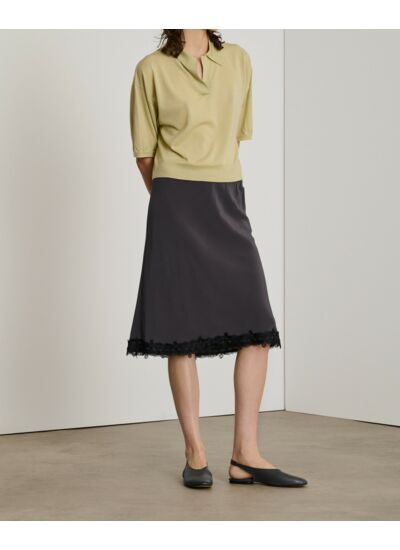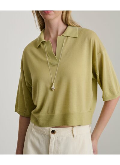 Coupe droite oversize courte, manches courtes, col polo souple, fine jauge. 100% laine mérinos. Marque : Soeur.