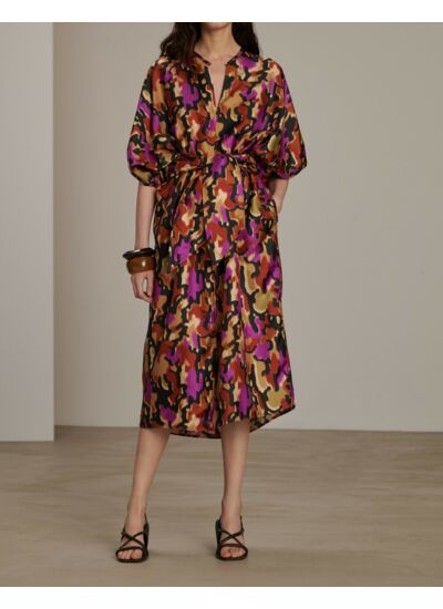 Profitez d’une liberté de mouvement optimale grâce à sa coupe généreuse, tout en bénéficiant de la douceur et de la légèreté de la soie, qui apporte une sensation agréable sur la peau. Cette robe est idéale pour celles qui recherchent une pièce à la fois chic et facile à porter au quotidien.