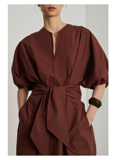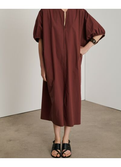100% coton organique, popeline légère. Coupe ample avec manches courtes froncées, encolure en V avec fronces au dos, poches latérales insérées. Lavage en machine recommandé, éviter le blanchiment, séchage à l’air libre conseillé, repassage à température moyenne, nettoyage à sec possible.