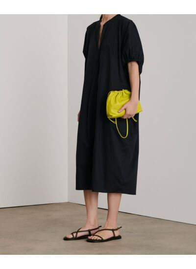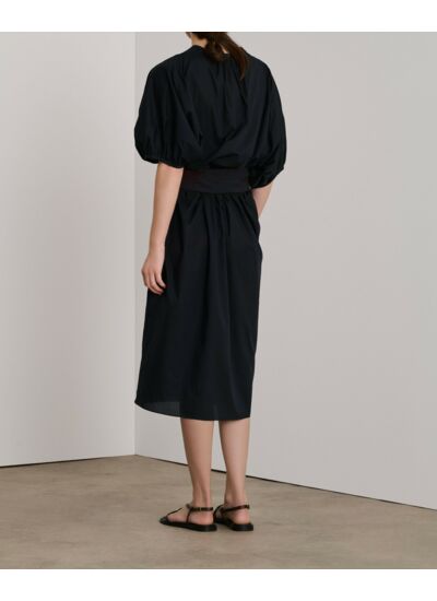 Conçue en popeline de coton léger, cette robe offre un confort optimal tout en restant raffinée. L’encolure en V fendue, rehaussée de fronces délicates autour du col et des manches, crée un jeu de volumes subtil et féminin. Pratique, elle intègre des poches discrètes dans les coutures latérales, parfaites pour garder l’essentiel à portée de main. Polyvalente, elle s’adapte aussi bien à une journée en ville qu’à une soirée habillée.