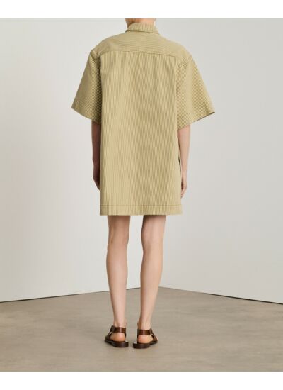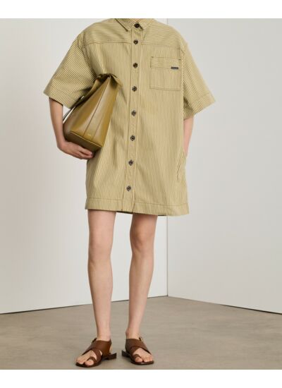 Adoptez l’élégance décontractée avec la robe courte en jean Anouk, un essentiel polyvalent à l’esprit workwear revisité. Sa coupe oversize et ses fines rayures blanches et beiges apportent une touche moderne à un classique intemporel.