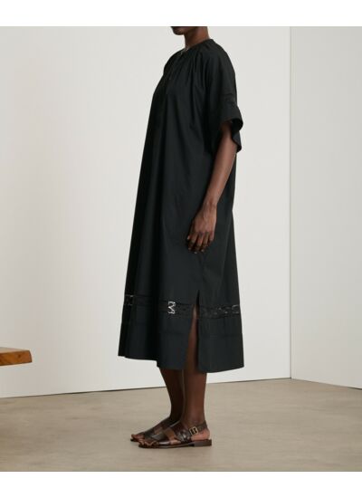 Conçue en popeline de coton légère, cette robe fluide séduit par son col officier froncé et ses manches courtes à revers ornées de galons brodés. La ceinture fine intégrée au dos affine la taille tout en conservant une allure décontractée. Pratique et chic, elle s’adapte aussi bien à un look urbain qu’à une occasion plus habillée, grâce à ses poches discrètes et sa patte de boutonnage devant.