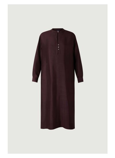 Profitez d’un vêtement qui valorise votre allure tout en assurant une liberté de mouvement grâce à sa coupe droite. Le col mao et les manches larges ajoutent une touche contemporaine, faisant de cette robe un choix versatile et durable dans votre garde-robe.