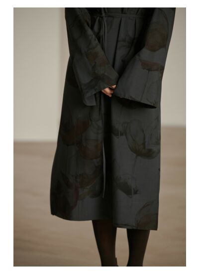 Composition : 75% laine vierge, 15% mohair, 10% polyamide/nylon. Coupe ample, encolure ronde, patte de boutonnage au dos, lien de serrage ajustable à la taille, poches insérées dans les coutures côté, fentes latérales en bas de corps.
