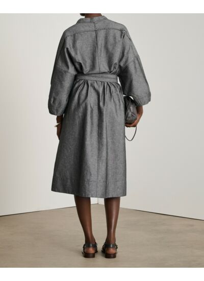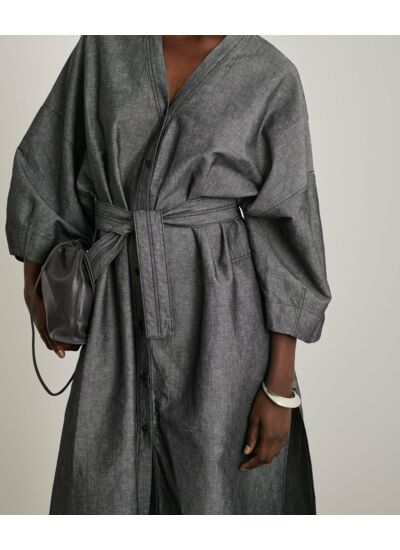 Conçue dans un tissu fil-à-fil mêlant coton et lin, cette robe joue sur un effet chiné noir et écru aux reflets irisés, apportant une touche unique à votre garde-robe. Son col en V et ses manches raglan généreuses offrent une liberté de mouvement tout en soulignant la féminité. Les longues fentes latérales et la ceinture amovible permettent d’ajuster la tenue selon vos envies, tandis que les poches discrètes ajoutent une fonctionnalité pratique.