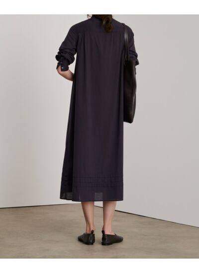 Coupe ample, longueur cheville, col mao boutonné, ouverture boutonnée devant, jeux de plis en bas et fronces au col. Tissu : voile de coton 100 % naturel, léger et respirant. Entretien : lavage en machine recommandé, éviter le blanchiment, séchage à l’air libre conseillé, repassage doux. Marque : Soeur.