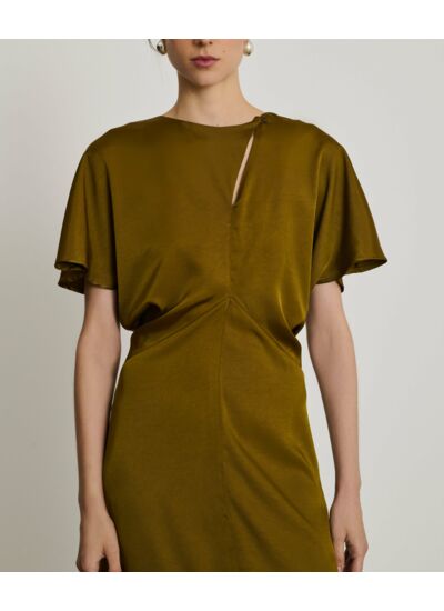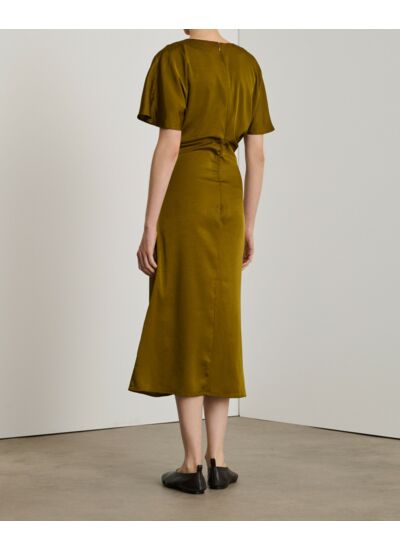 Coupe ajustée mi-mollet, col montant avec ouverture boutonnée, fermeture zippée invisible avec crochet, fente avant, détail drapé. Confectionnée en sergé de polyester fluide 100% polyester recyclé, elle allie durabilité et légèreté.