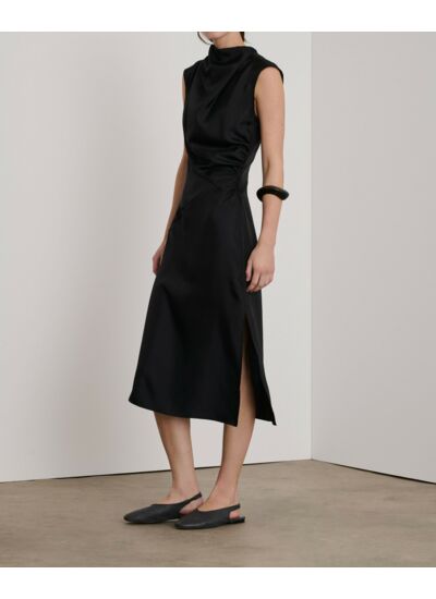 Coupe ajustée, col légèrement montant drapé, fente côté, ouverture zippée invisible avec crochet, détails de découpes et surpiqûres. Tissu : sergé de polyester 100% recyclé.