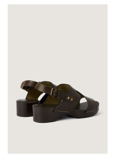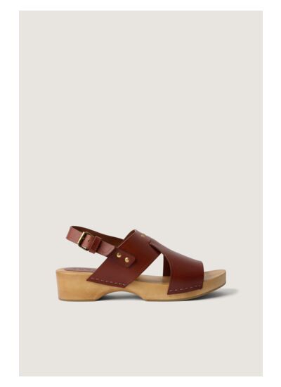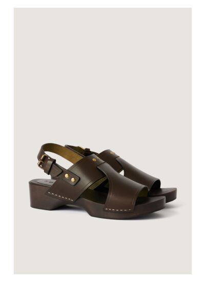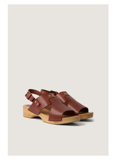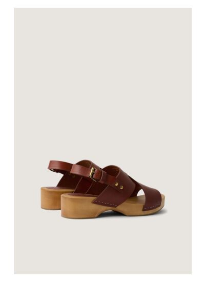 Sabot à talon compensé 5 cm en cuir de vache LWG, finition acajou. Semelle en bois naturel avec couche en crêpe pour amortir les chocs. Ouverture par bride ajustable. Détails rivets et agrafes dorés. Bout ouvert. Entretien : lavage interdit, blanchiment interdit, séchage en tambour à température modérée, repassage interdit, nettoyage à sec interdit.
