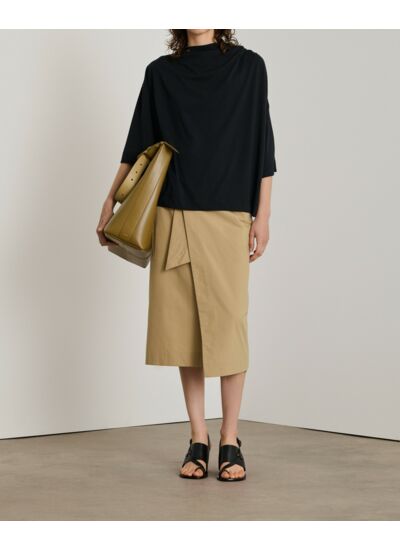 Conçu dans un coton Supima d’exception, ce tee-shirt offre une coupe ample et droite qui assure confort et liberté de mouvement. Les manches courtes et le col rond apportent une simplicité maîtrisée, tandis que le détail drapé crée un jeu de volumes raffiné, idéal pour une allure moderne et naturelle. Polyvalent, il se porte aussi bien en journée qu’en soirée, associé à un jean ou une jupe fluide.