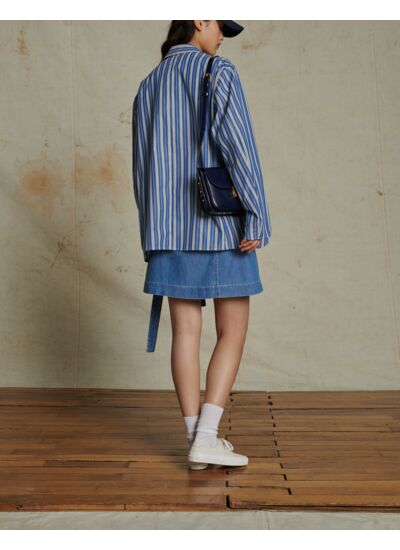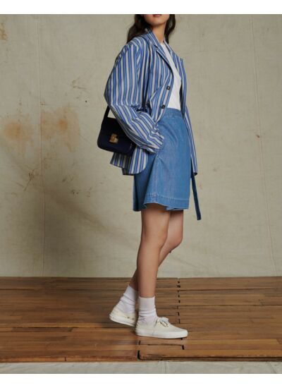 Adoptez l’élégance décontractée avec la veste Augustine, un essentiel qui allie confort et style. Sa coupe oversize et ses fines rayures bleues et blanches apportent une touche moderne à vos tenues.