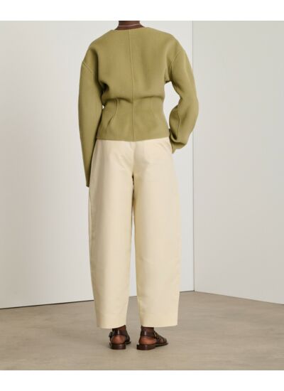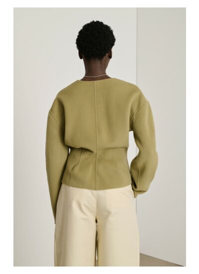 Conçue dans un lainage double-face, cette veste allie légèreté et chaleur douce pour un confort optimal toute la journée. Le bouton décalé souligne la taille avec subtilité, tandis que les pinces au dos renforcent l’effet ceinturé, offrant une silhouette parfaitement ajustée. Son col en V et son ouverture à double bouton garantissent une finition soignée et raffinée.