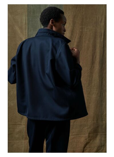 Veste en gabardine de laine navy, 55% polyester, 45% laine vierge. Coupe droite ample, col classique, ouverture boutonnée devant. Manches longues avec poignets boutonnés. Deux poches plaquées devant, une poche plaquée poitrine. Entretien : lavage, blanchiment, séchage, repassage et nettoyage à suivre selon les instructions spécifiques du fabricant.