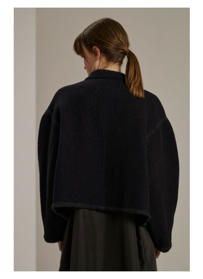 Cette veste courte joue sur les contrastes avec ses manches longues et emmanchures larges, offrant une liberté de mouvement optimale. Les poches passepoilées ornées d’une tresse appliquée et les finitions gansées témoignent d’un savoir-faire soigné, parfait pour un look à la fois raffiné et décontracté.