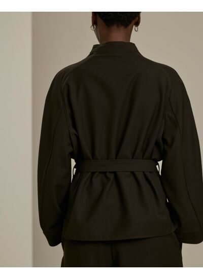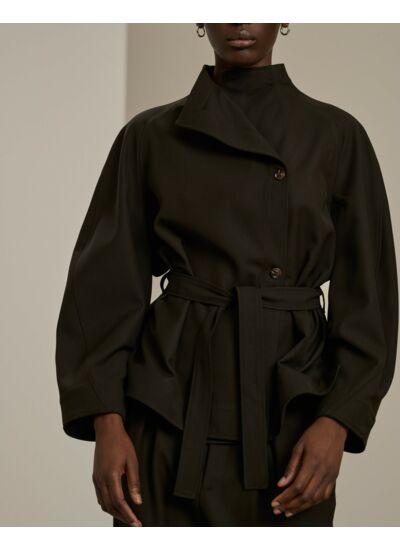 Affirmez votre style avec cette veste en gabardine de laine gris anthracite, alliant élégance et modernité. Sa coupe droite ample et son volume court ceinturé créent une silhouette contemporaine et structurée.