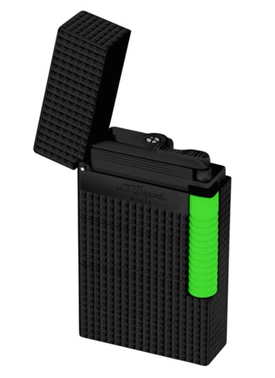 Designed to bring new energy to our classics - and to our everyday lives, the pieces in the Fluo collection are inspired by the latest trends in fashion and automotive design. With Fluo, the legendary S.T. Dupont's legendary lacquer takes all the liberty it can, becoming pop and light, for lives that are always on the move, dynamic and whirring. The Grand Dupont is adorned with a diamond-tipped guilloche, a semi-matt black finish with a ""silky"" feel, and a fluorescent blue trigger. Its dual-flame system features a low first flame for gentle, gradual heating of the cigar, while a powerful torch flame ensures optimal ignition in all circumstances.