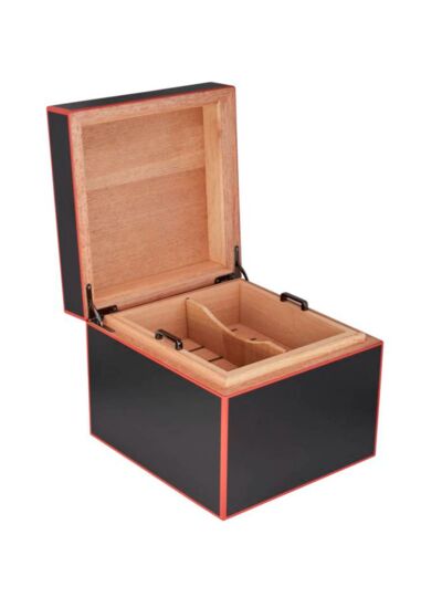 Cube cigar humidor decorated with skulls, flowers, red outline, and golden hinges.