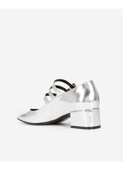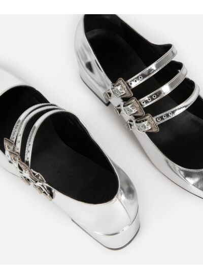 Conçues dans un cuir lisse d’une grande qualité, ces babies dévoilent une finition argentée qui capte la lumière avec subtilité. Leur bout rond et leur talon large de 4 cm offrent une silhouette féminine sans sacrifier la stabilité, idéale pour une journée active ou une soirée chic. Les boucles en métallerie argentée ajoutent une touche de caractère, renforçant le design contemporain de la chaussure.