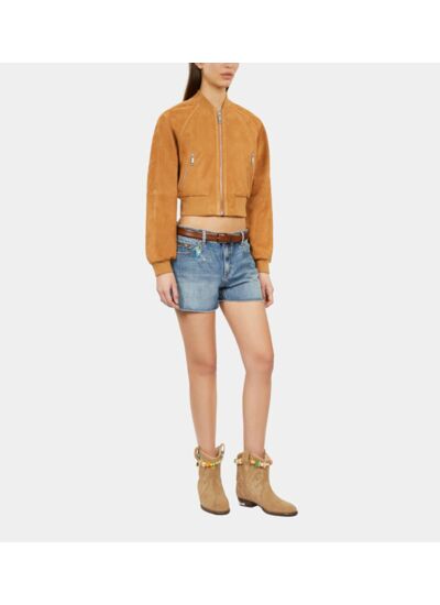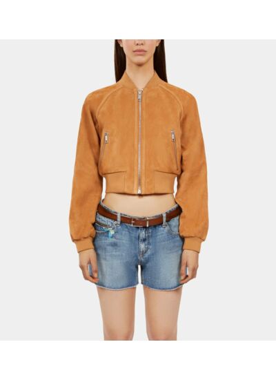 Col rond, manches longues, fermeture zippée, poches zippées sécurisées, bords côtes pour un maintien optimal. Matière : cuir suède camel. Coupe courte. Marque : The Kooples.