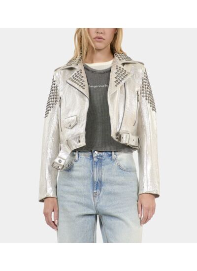 Affirmez votre style avec ce blouson clouté en cuir argenté signé The Kooples, une pièce audacieuse qui sublime chaque tenue. Son allure métallique et ses détails rock apportent une touche contemporaine et élégante à votre garde-robe.