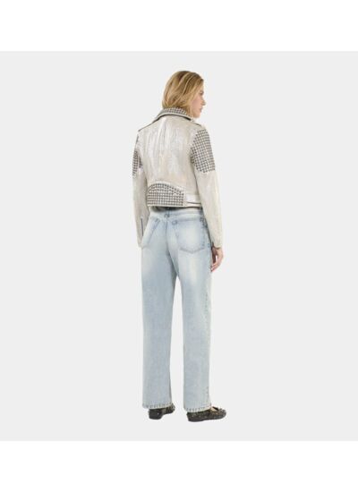 Réponse. Le blouson est court et droit, conçu pour une silhouette ajustée et moderne.