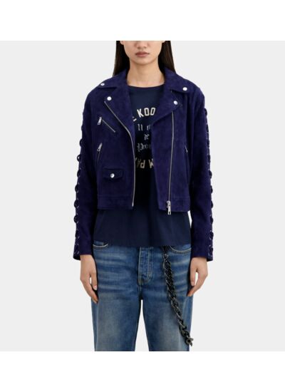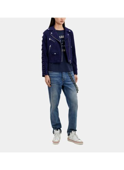Confectionné en cuir suédé de qualité, ce blouson se distingue par ses manches courtes et une sérigraphie subtile sur le devant, qui apporte une touche graphique unique. Léger et facile à porter, il s’adapte parfaitement aux transitions saisonnières et s’intègre aussi bien à un look casual qu’à une tenue plus travaillée.