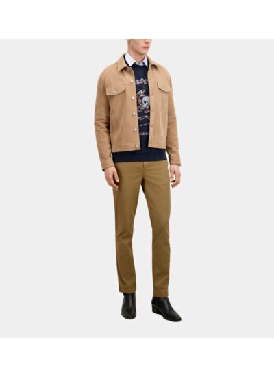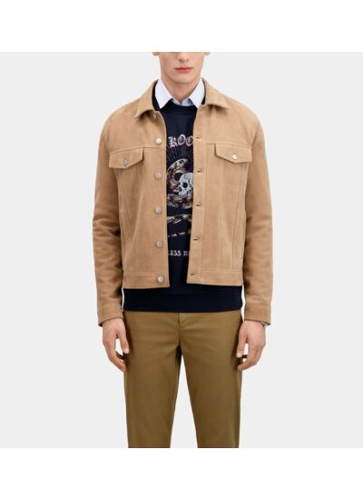 Confectionné en cuir suédé de qualité, ce blouson se distingue par son col classique et ses manches longues parfaitement ajustées. Sa coupe moderne épouse la silhouette sans contrainte, tandis que la fermeture à boutons apporte une touche vintage assumée. Les poches à rabat sur la poitrine et les poches latérales passepoilées renforcent son caractère fonctionnel et stylé.