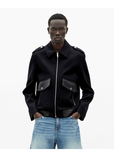 Confectionné en laine de qualité, ce blouson offre une silhouette structurée grâce à son col classique et ses pattes d’épaule, qui renforcent son caractère masculin. Les manches longues et la fermeture zippée garantissent un confort optimal, tandis que les poches plaquées à rabat et les touches de cuir apportent une finition raffinée et fonctionnelle.
