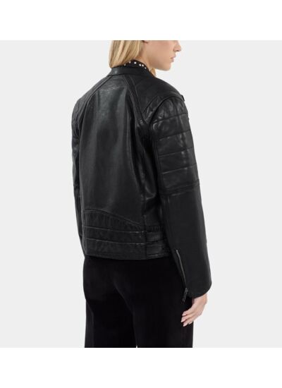 Confectionné en cuir véritable, ce blouson droit épouse parfaitement la silhouette féminine tout en offrant une allure moderne et affirmée. Son col officier à boutons pression et ses détails matelassés apportent une touche rock chic, tandis que les manches longues zippées renforcent son caractère fonctionnel et tendance. Polyvalent, il se porte aussi bien en journée qu’en soirée, pour une allure toujours impeccable.