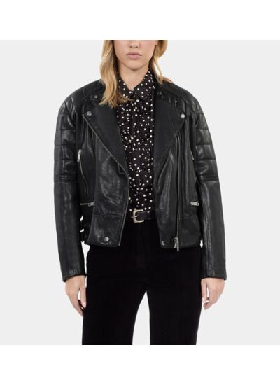 Blouson droit en cuir noir pour femme The Kooples. Col officier avec boutons pression. Fermeture zippée. Manches longues avec zip. Poches zippées. Boucles ajustables à la taille. Détails matelassés pour une finition soignée.