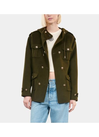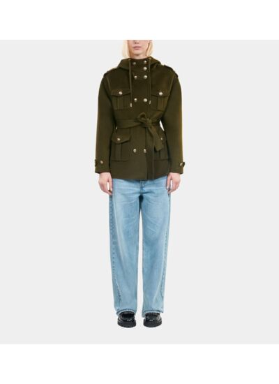 Confectionné dans un mélange de laine double face, ce blouson offre une chaleur optimale tout en restant léger. La capuche ajustable avec cordon de serrage et les pattes d’épaule renforcent son allure structurée, tandis que la ceinture amovible souligne la taille pour une silhouette féminine. Les poignets ceinturés et la fermeture double boutonnage apportent une finition élégante et pratique.