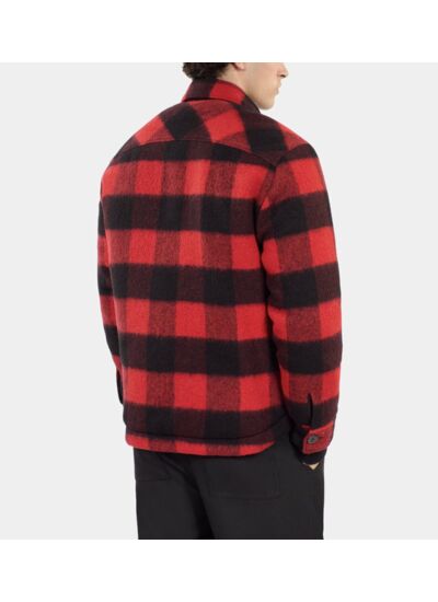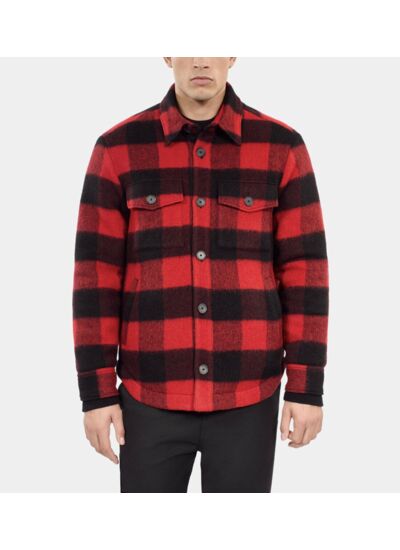 Ce blouson homme The Kooples présente un motif à carreaux noirs et rouges, une coupe large avec col classique, manches longues, boutonnage devant et poches plaquées à rabat. Les boutons en corne apportent une finition élégante et authentique.