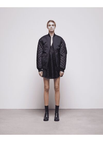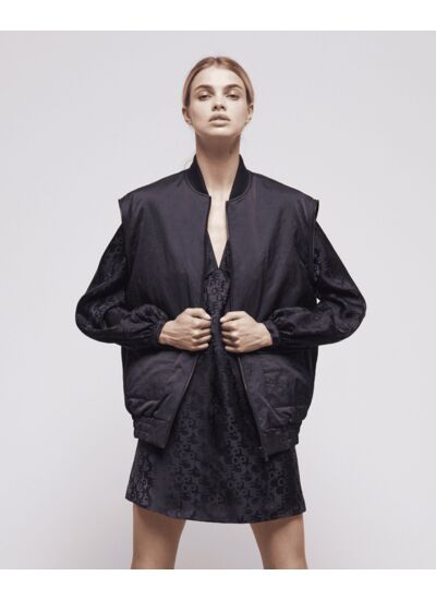 Bomber bimatière noir avec manches longues effet satin amovibles et matelassées. Fermetures zippées aux manches. Intérieur matelassé. Deux poches à rabat. Marque : The Kooples.