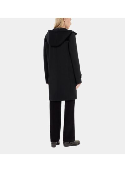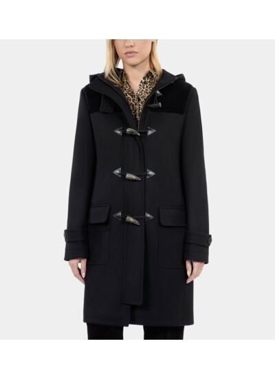 Manteau femme The Kooples, caban à capuche noir, coupe ajustée, matière chaude et résistante, fermeture boutonnée, poches latérales discrètes.