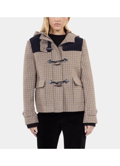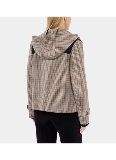 Manteau court femme, motif pied de poule beige, capuche intégrée, coupe ajustée, tissu chaud et résistant. Marque : The Kooples.